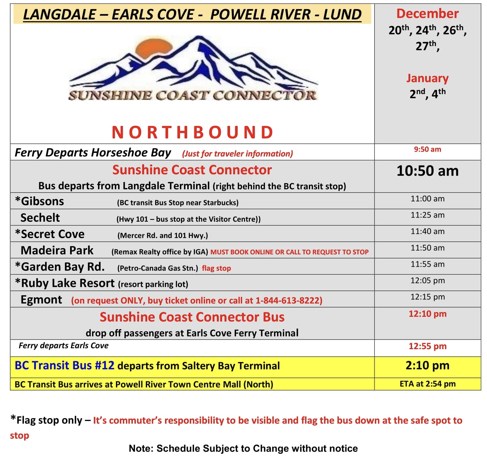 Our bus is operating northbound from LANGDALE to EARLS COVE, and southbound from EARLS COVE to SECHELT, where you will be connected with BC Transit express #90 that will take passengers to Langdale ferry terminal.
